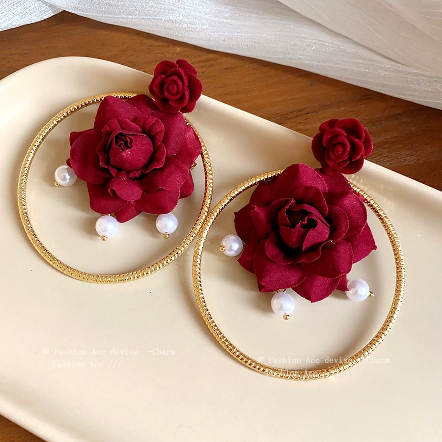 The Rose Hoop Earrings are a striking blend of floral charm and vintage elegance. Each earring showcases a large handcrafted rose nestled within a textured golden hoop, complemented by a smaller rose at the top for layered dimension. Dangling from the base are three pearl-like beads that add movement and a soft contrast to the bold floral centerpiece. Perfect for festive occasions, traditional wear, or romantic styling, these earrings offer a dramatic yet graceful silhouette. Their intricate detailing and balanced composition make them a standout accessory for those who love expressive design and timeless beauty.