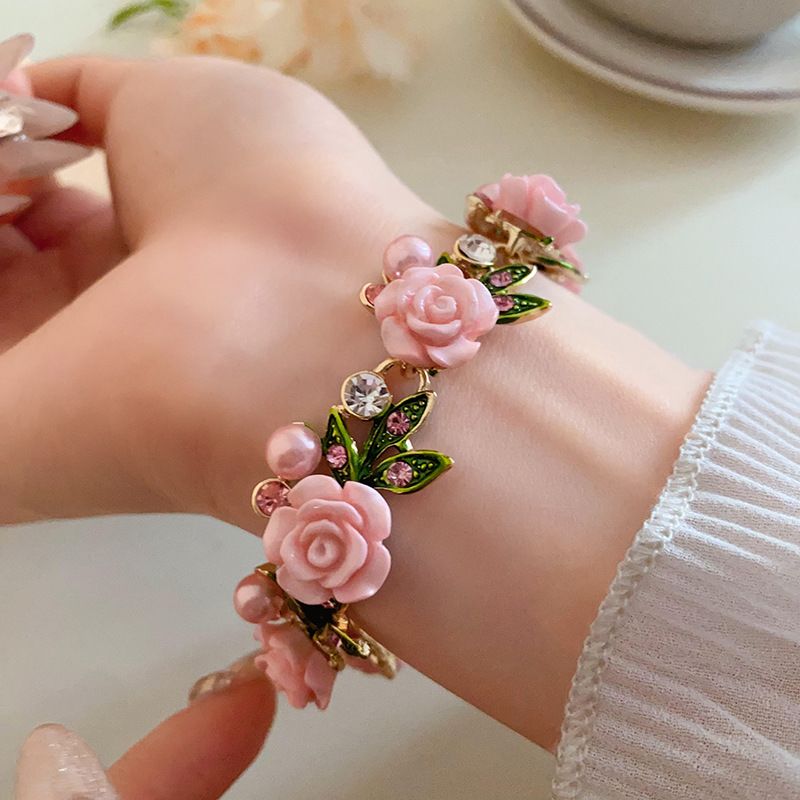 A poetic tribute to twilight blooms, the Flora Nocturne set pairs sculpted purple roses with delicate green leaves and shimmering beads in soft pink and violet. The necklace cascades gracefully across the collarbone, each floral element meticulously arranged to evoke a garden in moonlight. Matching earrings mirror the motif with layered blossoms and leaf accents, framing the face with romantic symmetry.
