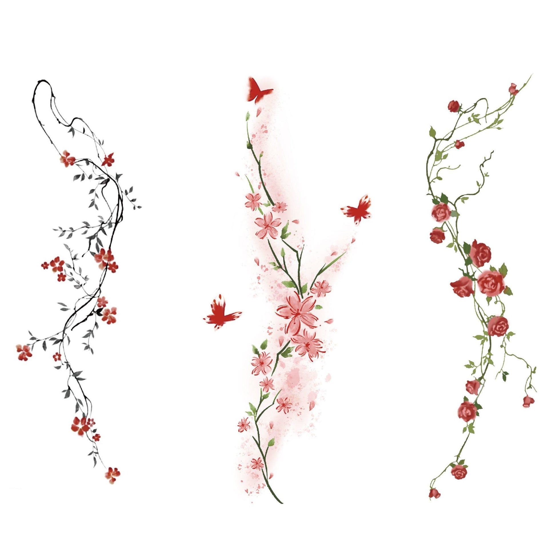 Turn your décolletage into a springtime dream with this breathtaking cherry blossom temporary tattoo. A graceful branch of soft pink sakura flowers sweeps elegantly across the collarbone, accented by scattered petals and two vivid red butterflies that appear to flutter with every breath. The ultra-fine, watercolor-style detailing gives it an incredibly realistic, almost hand-painted look that photographs beautifully.